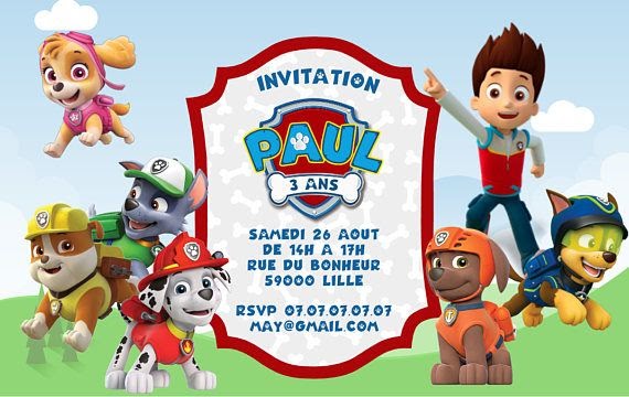 17 avr 19 Découvrez le tableau "4 ans" de Krystel Goyer sur Voir plus d'idées sur le thème anniversaire paw patrol, anniversaire pat patrouille, paw patrolTexte Invitation Anniversaire 4 Ans Pat Patrouille Pat Patrouille Invitations Anniversaire A Imprimer 123 Carte Anniversaire Pat Patrouille Invitation Anniversaire Garcon Cartes Invitation Anniversaire EnfantPat Patrouille, une patrouille de 9 chiens menés par un jeune garçon de 10 ans, Ryder, est la nouvelle série préférée de votre enfant Chaque chien a sa propre spécialité, telle que sauveteur en montagne ou pompier, et intervient en fonction de la situation